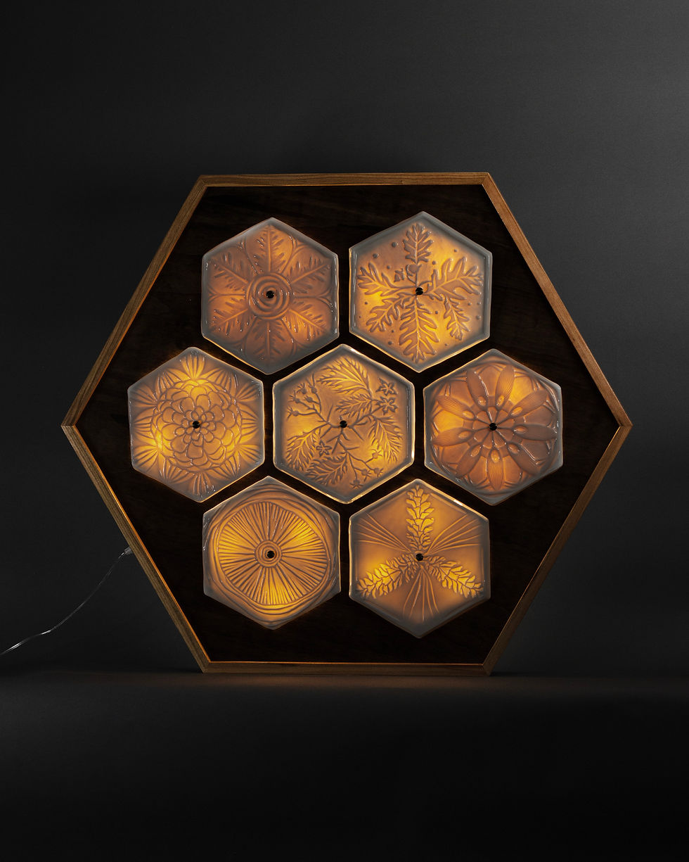 To represent each of the four seasons in North America, seven local plants from the Outaouais region in Québec were chosen. Specific plants were selected based on the relationship and personal anecdotes the artists had with each one. Each piece was engraved into a slab of clay, from which a plaster mold was made. Liquid porcelain was poured into the moulds to produce a very thin and translucent tile.